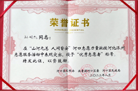 近日,学校收到由东营市河口区文明办、共青团河口区委、河口区民政局联合颁发给我校医学系2022级医学检验技术2班退役大学生孙明杰同学的“优秀志愿者”荣誉证书和东营市河口区蓝天救援队发来的抗洪抢险救援工作证明。