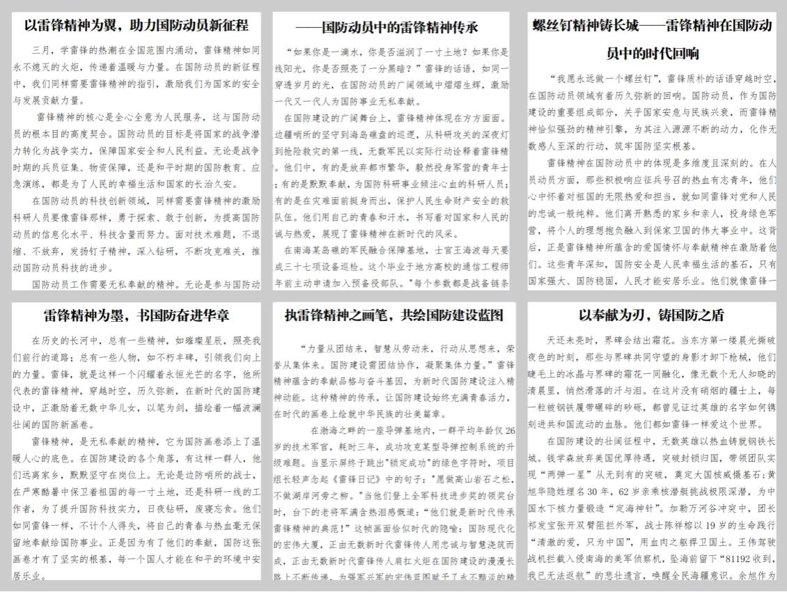本次活动以“雷锋精神”为引领,将雷锋精神的内涵与新时代国防建设相结合,通过撰写征文的方式,激发青年学生的爱国热情和社会责任感。本次征文活动面向全系学生开放,共收到投稿127篇,同学们用充满情感的文章,展现了医学生对雷锋精神和国防事业的深刻理解和独特见解。活动后,同学们纷纷表示,将以实际行动践行雷锋精神,积极参与国防教育相关活动,传递社会正能量。