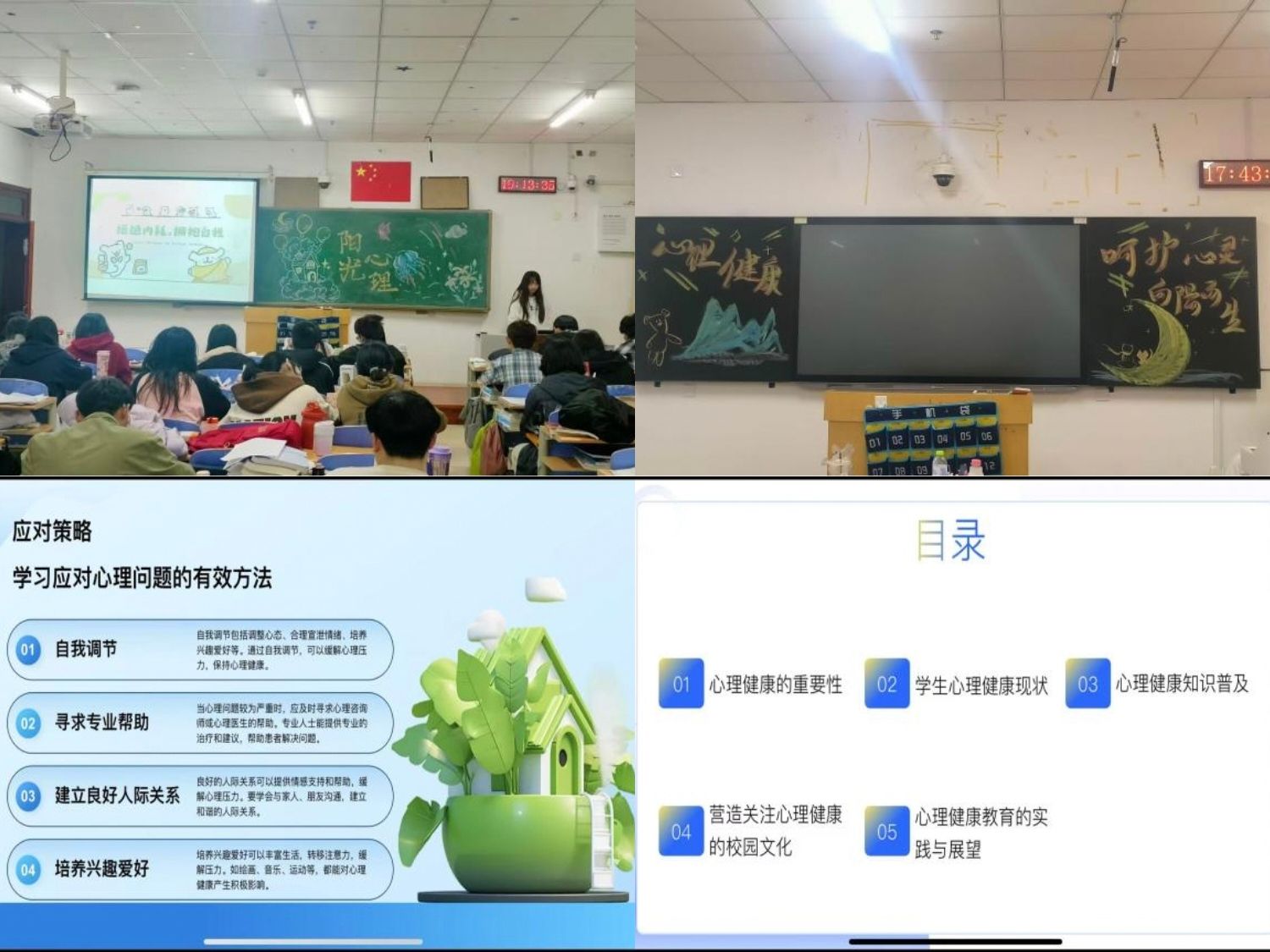 在“润心启智,逐光同行”心理健康月中,以制作PPT和黑板报的方式,全方面展现了同学们对自我内心世界的探索渴望,也搭建起一座沟通心灵的桥梁。黑板报以图文并茂的形式,将晦涩的心理学概念转化为生动的漫画、趣味标语和暖心小贴士,成为校园里无声的心理科普阵地;PPT则整合了权威数据、真实案例和专家讲解视频,系统梳理心理健康的标准、常见心理问题及解决方法。随后,各班心理委员结合生动案例,深入浅出讲解了心理健康的重要性、常见心理问题的识别、科学的应对方法以及构建和谐心理环境的实践路径,强调良好的心理状态是学业进步、人际交往和谐的基石。