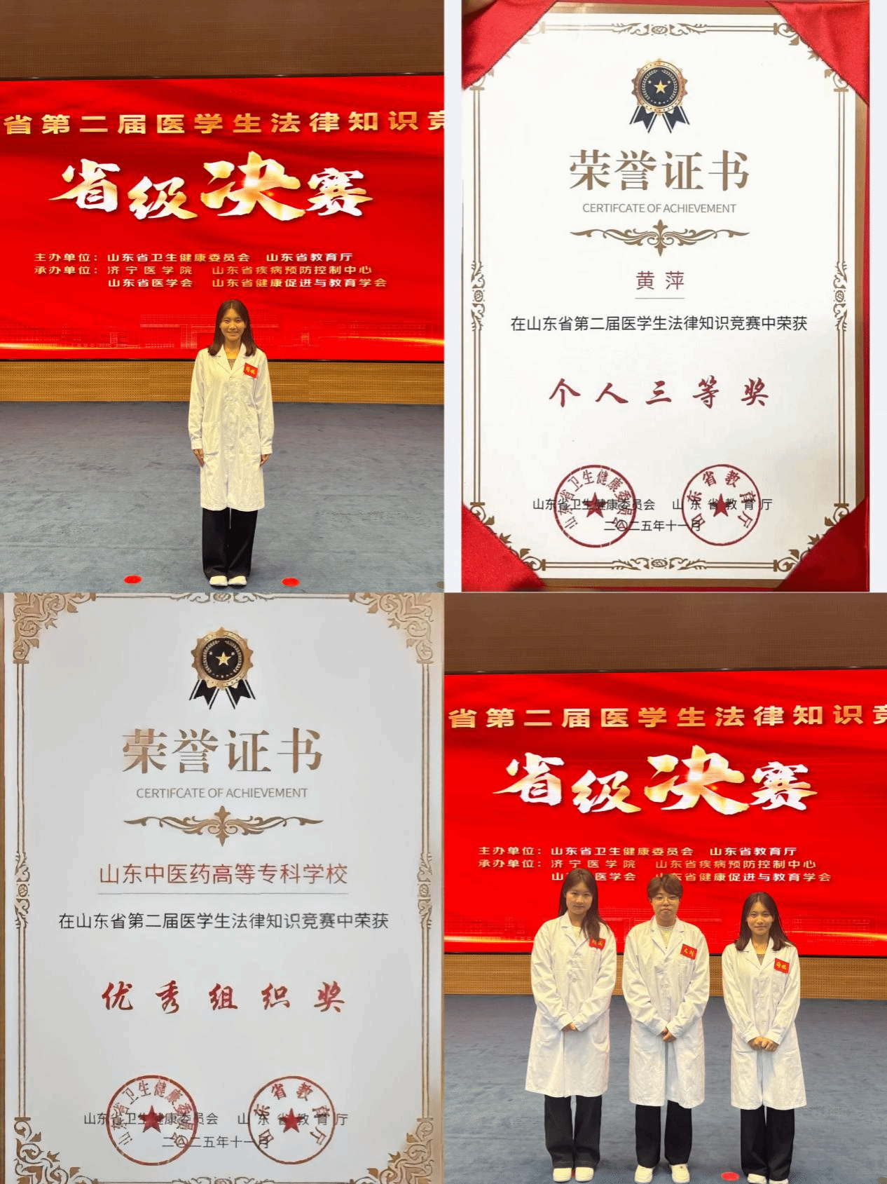 近期,由山东省卫生健康委员会与济宁医学院举办的“山东卫健委第二届卫生法规知识竞赛”圆满落幕。经过多轮紧张激烈的比拼,我校黄萍同学凭借出色的表现斩获佳绩,荣获个人三等奖,我校荣获优秀组织奖。