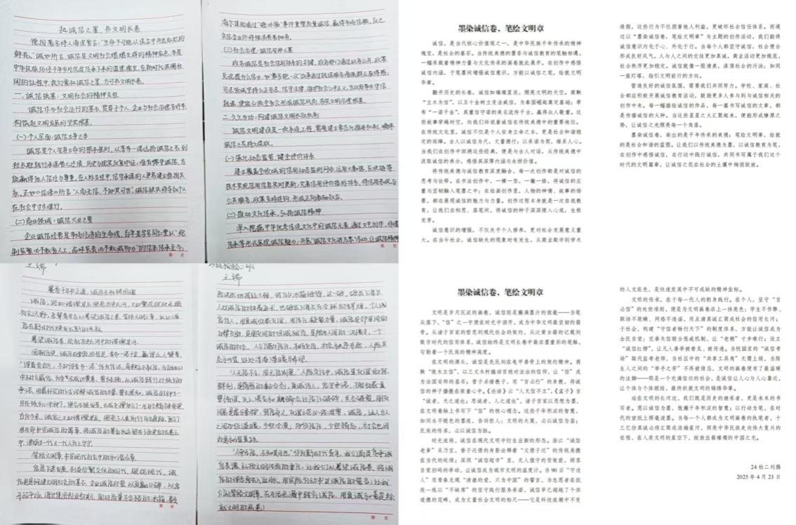 本次活动通过征文的形式,围绕着诚信的内涵价值、典型案例以及文明践行等方面展开创作。同学们在作品中分享古今诚信故事、解读诚信经典文献、展示诚信现实文明,由浅入深地阐述了诚信的历史传承、社会意义等核心内容,详细剖析了践行诚信的具体方式与养成路径,深化了同学们对诚信文明的系统认知。活动过程中,同学们热情高涨,以笔为媒,各抒己见,诚信金句跃然纸上,传递着质朴而深刻的价值理念。同时,大家积极交流创作思路,踊跃分享身边的诚信案例与感悟体会,诚信精神在交流与分享中不断升华。