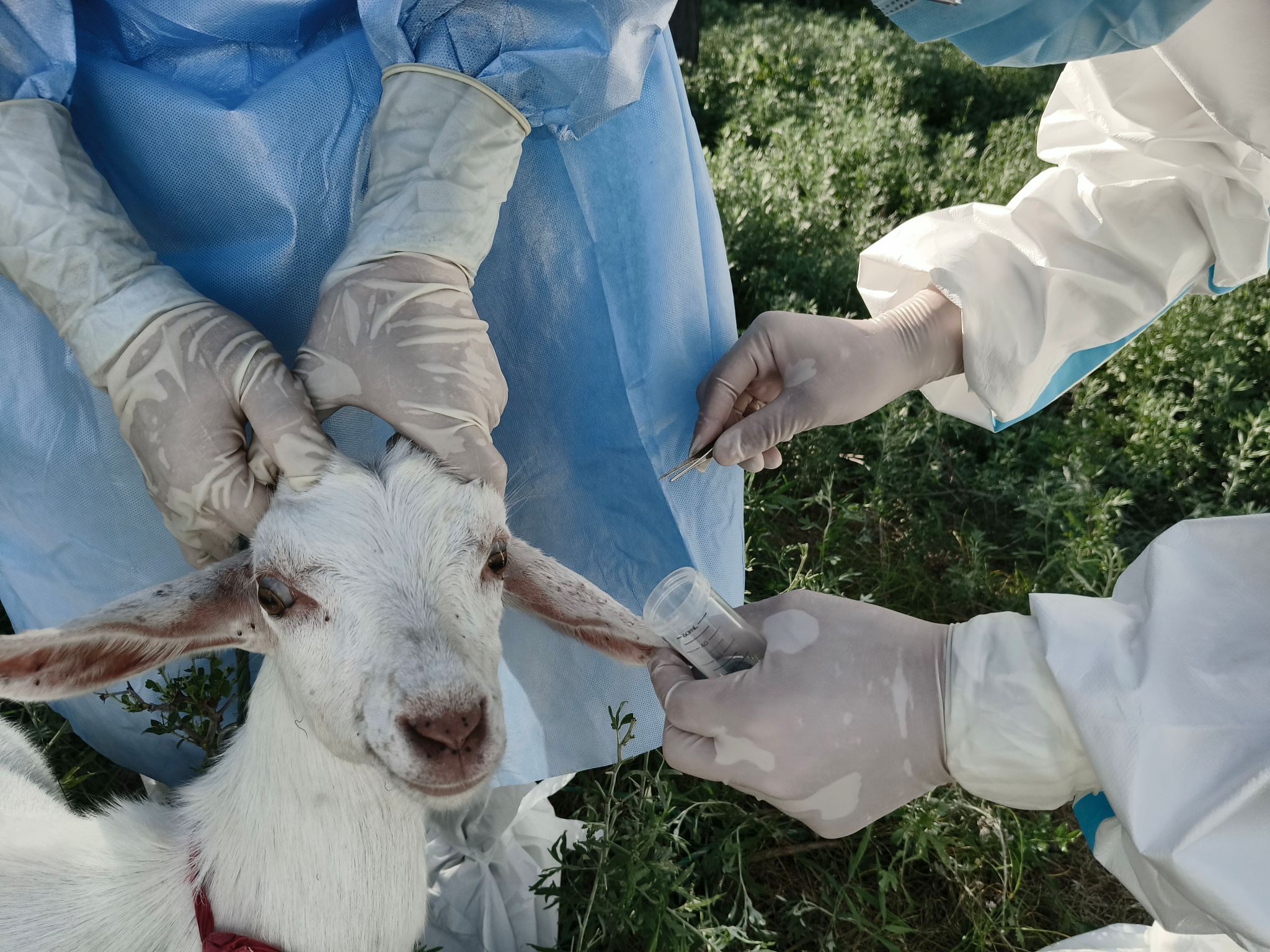 7月19日下午,监测团队抵达大濠村畜牧养殖集中区。在黑山卫生院的协助下,团队成员身着防护服,携带专业采样工具,对该村2个养殖户的山羊展开系统性检查。监测重点聚焦动物耳廓、眼周、口鼻、颈部等蜱虫易寄生部位,采用“宿主体检蜱法”进行地毯式排查。现场操作中,团队成员以镊子精准夹取寄生蜱虫,严格遵循“一宿主一管”原则,将标本按雌雄、饱血状态等特征分类封装于促凝管中,并同步记录宿主品种、年龄、寄生部位等数据。团队志愿者李佳表示:“本次'三下乡'社会实践活动让我深刻体会到学以致用的价值。作为预防医学专业的学生,我们在课堂学习的专业知识,今天终于能应用到真实场景中。未来我会更加注重将专业技能与乡村振兴需求相结合,用实际行动践行新时代青年的责任担当。”